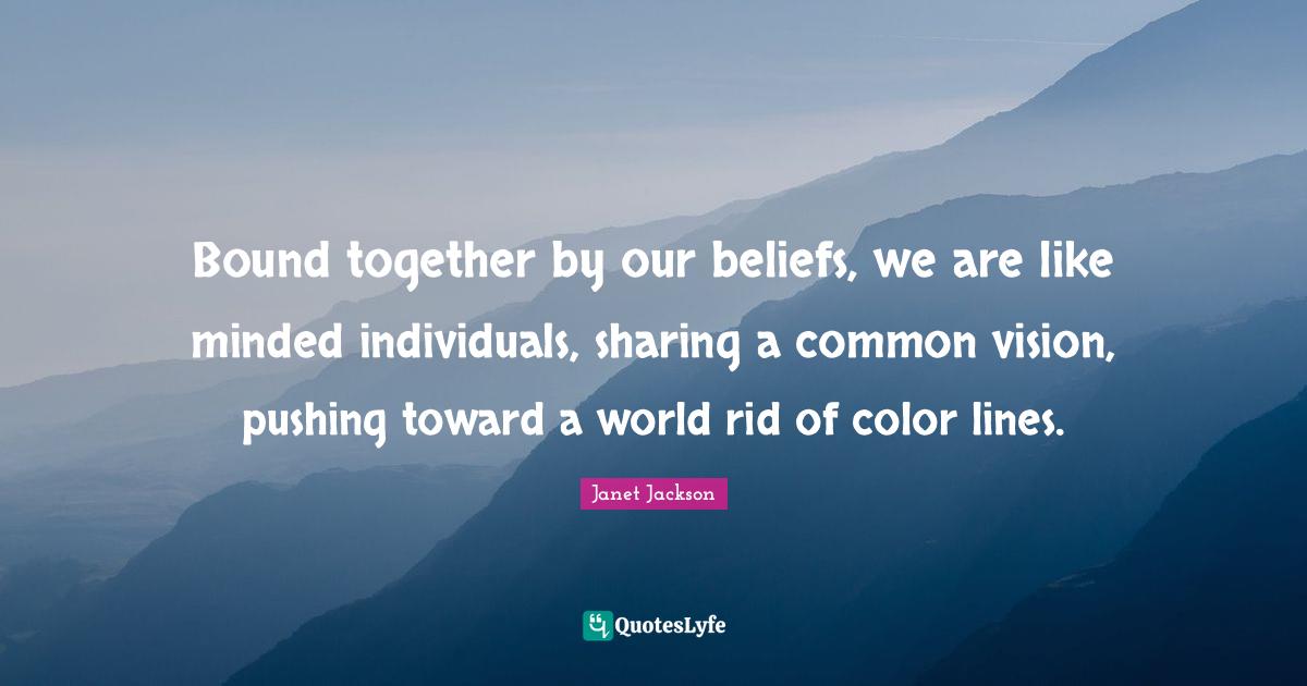 This page presents the quote "Bound together by our beliefs, we are like minded individuals, sharing a common vision, pushing toward a world rid of color lines.". Author of this quote is Janet Jackson. This quote is about pushing, together, common vision, color, lines, world,.