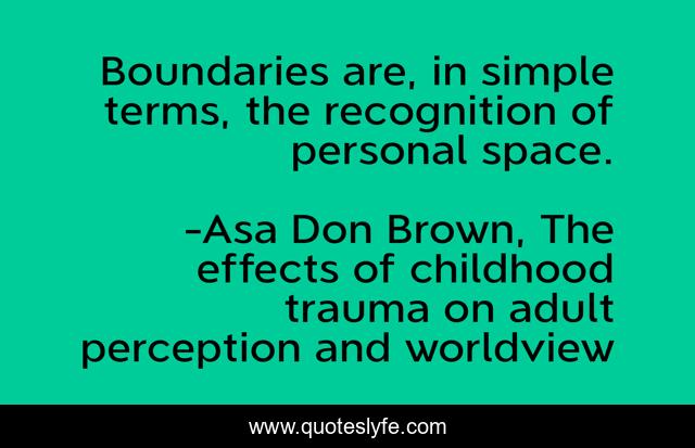 This page presents the quote "Boundaries are, in simple terms, the recognition of personal space.". Author of this quote is Asa Don Brown, The effects of childhood trauma on adult perception and worldview. This quote is about resiliency, rad, recovery, capella-university, boundaries, childhood-trauma, trauma, laughter, ptsd,.