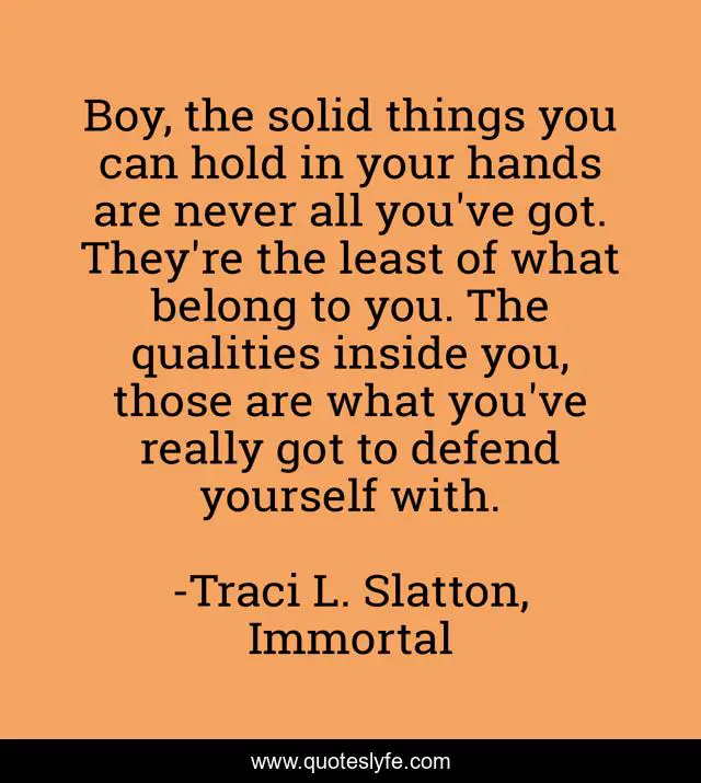 This page presents the quote "Boy, the solid things you can hold in your hands are never all you've got. They're the least of what belong to you. The qualities inside you, those are what you've really got to defend yourself with.". Author of this quote is Traci L. Slatton, Immortal. This quote is about strength-of-character, perseverance, courage, wisdom,.