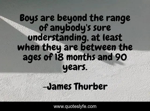 This page presents the quote "Boys are beyond the range of anybody's sure understanding, at least when they are between the ages of 18 months and 90 years.". Author of this quote is James Thurber. This quote is about boys, men,.