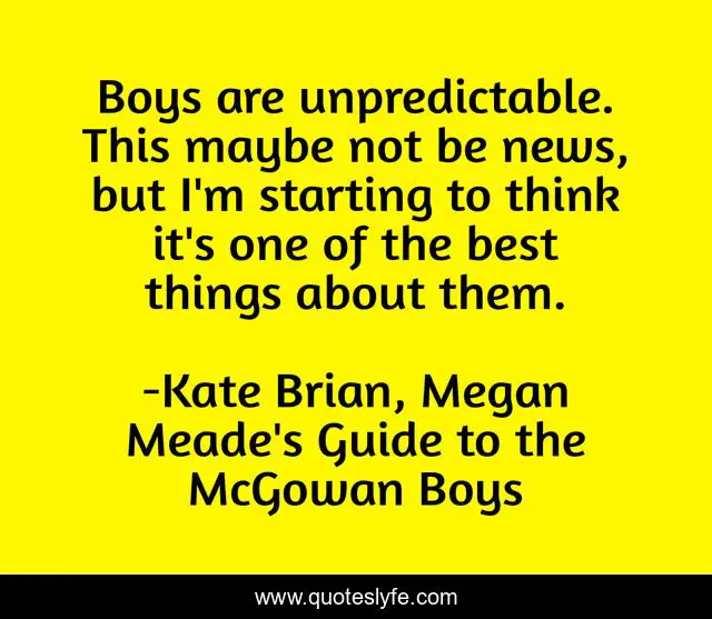 This page presents the quote "Boys are unpredictable. This maybe not be news, but I'm starting to think it's one of the best things about them.". Author of this quote is Kate Brian, Megan Meade's Guide to the McGowan Boys. .