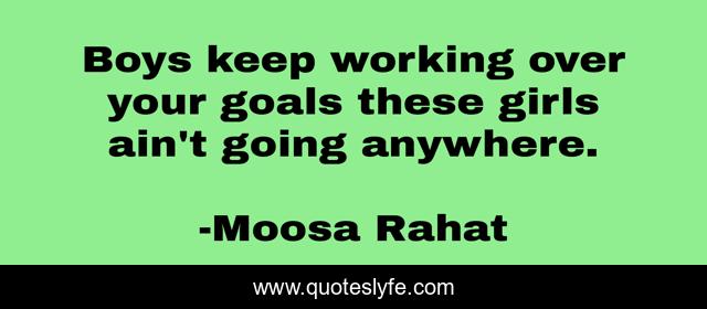 This page presents the quote "Boys keep working over your goals these girls ain't going anywhere.". Author of this quote is Moosa Rahat. This quote is about boys, girls, goals, working,.