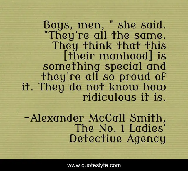 This page presents the quote "Boys, men, " she said. "They're all the same. They think that this [their manhood] is something special and they're all so proud of it. They do not know how ridiculous it is.". Author of this quote is Alexander McCall Smith, The No. 1 Ladies' Detective Agency. This quote is about manhood, men,.