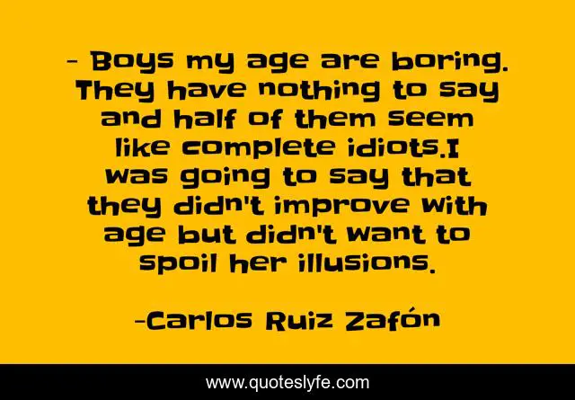 This page presents the quote "- Boys my age are boring. They have nothing to say and half of them seem like complete idiots.I was going to say that they didn't improve with age but didn't want to spoil her illusions.". Author of this quote is Carlos Ruiz Zafón. This quote is about boring, idiots, boys, zafon,.