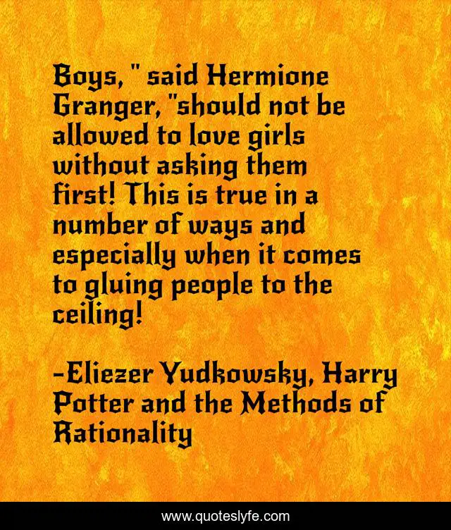This page presents the quote "Boys, " said Hermione Granger, "should not be allowed to love girls without asking them first! This is true in a number of ways and especially when it comes to gluing people to the ceiling!". Author of this quote is Eliezer Yudkowsky, Harry Potter and the Methods of Rationality. This quote is about fanfiction, harry-potter,.