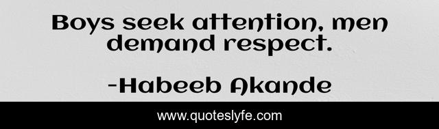 This page presents the quote "Boys seek attention, men demand respect.". Author of this quote is Habeeb Akande. This quote is about respect, attention, attention-seekers,.