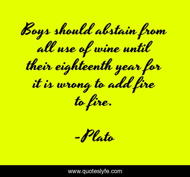 This page presents the quote "Boys should abstain from all use of wine until their eighteenth year for it is wrong to add fire to fire.". Author of this quote is Plato. This quote is about , drinking, drink, drinkers,.