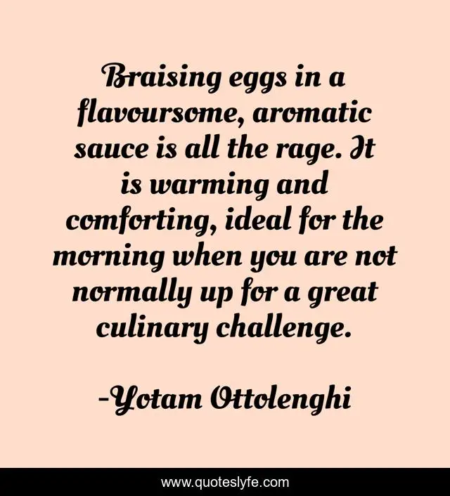 This page presents the quote "Braising eggs in a flavoursome, aromatic sauce is all the rage. It is warming and comforting, ideal for the morning when you are not normally up for a great culinary challenge.". Author of this quote is Yotam Ottolenghi. This quote is about great, challenge,.
