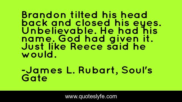 This page presents the quote "Brandon tilted his head back and closed his eyes. Unbelievable. He had his name. God had given it. Just like Reece said he would.". Author of this quote is James L. Rubart, Soul's Gate. This quote is about christian, brandon-scott, james-rubart, soul-s-gate, fiction,.