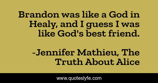 This page presents the quote "Brandon was like a God in Healy, and I guess I was like God's best friend.". Author of this quote is Jennifer Mathieu, The Truth About Alice. This quote is about bullying, lies, rumors, truth,.