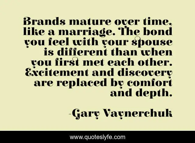 This page presents the quote "Brands mature over time, like a marriage. The bond you feel with your spouse is different than when you first met each other. Excitement and discovery are replaced by comfort and depth.". Author of this quote is Gary Vaynerchuk. This quote is about comfort, time, discovery,.