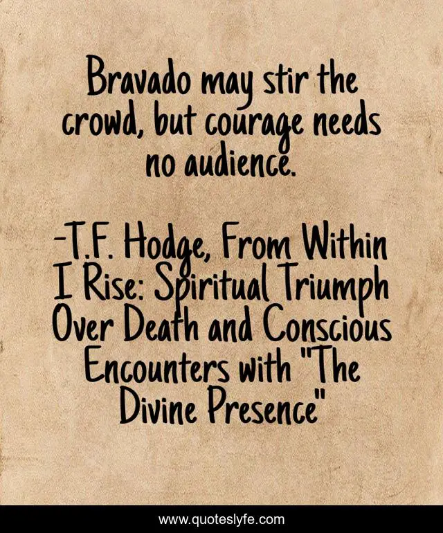 "T.F. Hodge, From Within I Rise: Spiritual Triumph Over Death and Conscious Encounters with "The Divine Presence" Quotes." Quoteslyfe.com, 2025. Sat. 06 Dec. 2025. <https://www.quoteslyfe.com/quote/Bravado-may-stir-the-crowd-but-courage-22203>.
