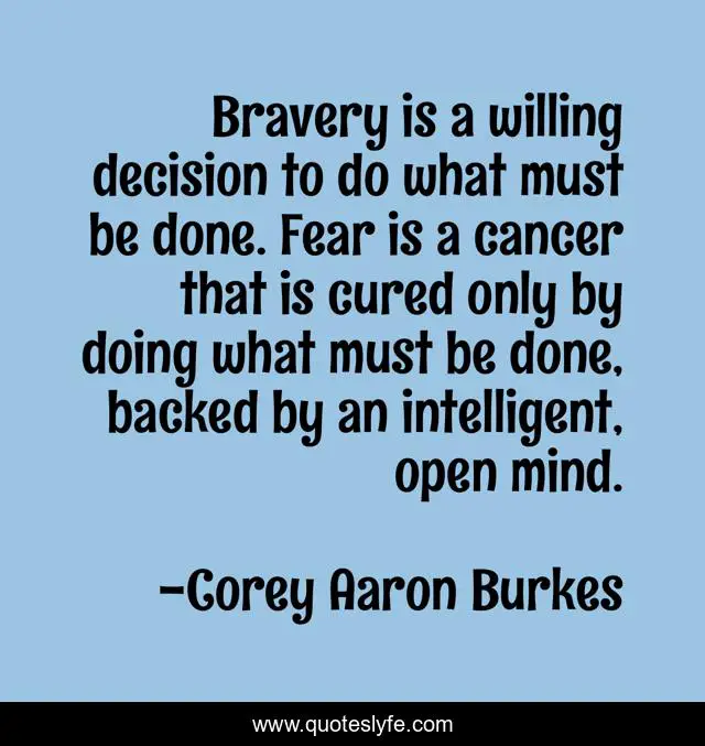 This page presents the quote "Bravery is a willing decision to do what must be done. Fear is a cancer that is cured only by doing what must be done, backed by an intelligent, open mind.". Author of this quote is Corey Aaron Burkes. This quote is about brave, cancer, courage, fear, intelligent, bravery,.
