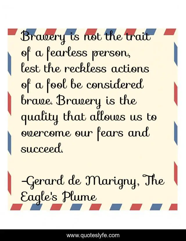 This page presents the quote "Bravery is not the trait of a fearless person, lest the reckless actions of a fool be considered brave. Bravery is the quality that allows us to overcome our fears and succeed.". Author of this quote is Gerard de Marigny, The Eagle's Plume. This quote is about enthusiasm, bravery, inspirational, success,.