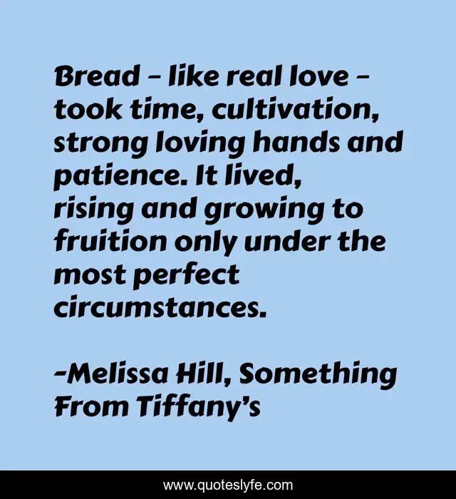 This page presents the quote "Bread – like real love – took time, cultivation, strong loving hands and patience. It lived, rising and growing to fruition only under the most perfect circumstances.". Author of this quote is Melissa Hill, Something From Tiffany’s. This quote is about patience, love, affection, bread,.