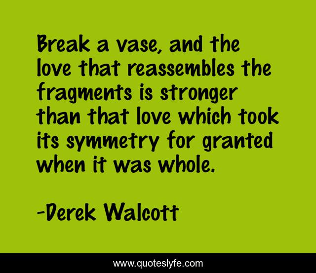 This page presents the quote "Break a vase, and the love that reassembles the fragments is stronger than that love which took its symmetry for granted when it was whole.". Author of this quote is Derek Walcott. .