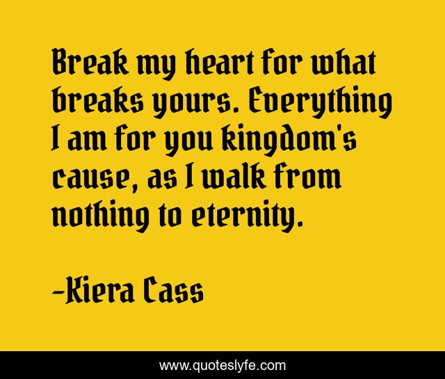 This page presents the quote "Break my heart for what breaks yours. Everything I am for you kingdom's cause, as I walk from nothing to eternity.". Author of this quote is Kiera Cass. This quote is about romance, the-elite, young-adult, twitter,.