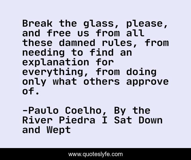 This page presents the quote "Break the glass, please, and free us from all these damned rules, from needing to find an explanation for everything, from doing only what others approve of.". Author of this quote is Paulo Coelho, By the River Piedra I Sat Down and Wept. .