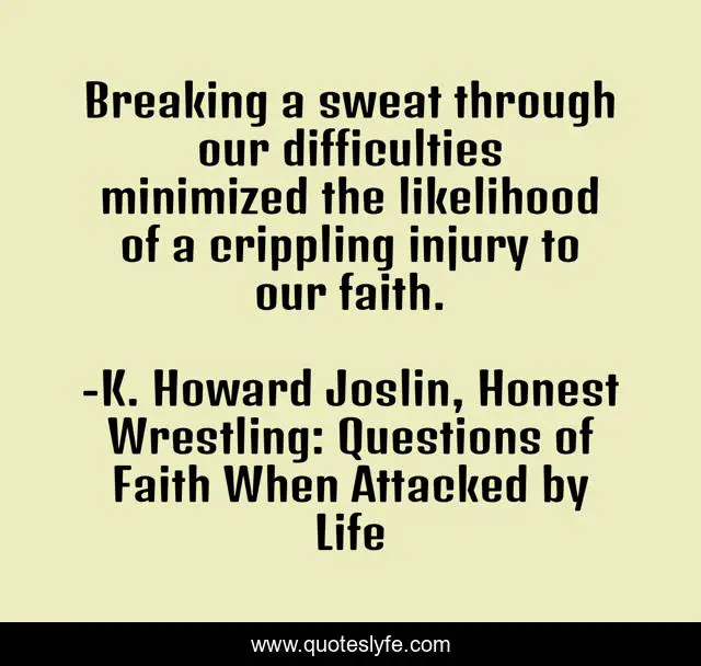 This page presents the quote "Breaking a sweat through our difficulties minimized the likelihood of a crippling injury to our faith.". Author of this quote is K. Howard Joslin, Honest Wrestling: Questions of Faith When Attacked by Life. This quote is about faith, suffering, questions, trials,.