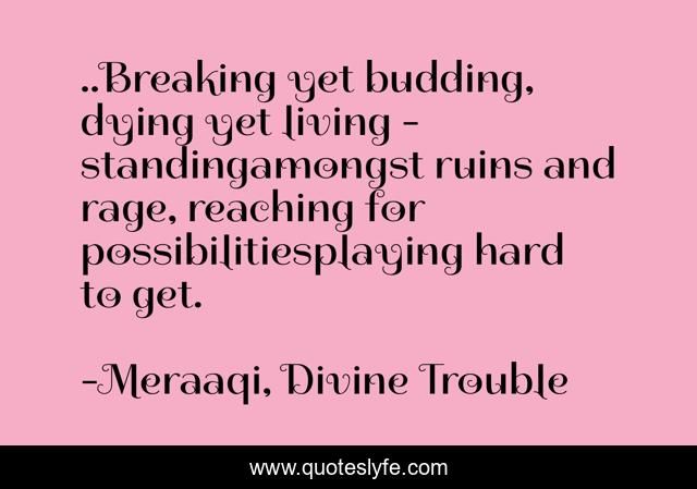 This page presents the quote "..Breaking yet budding, dying yet living - standingamongst ruins and rage, reaching for possibilitiesplaying hard to get.". Author of this quote is Meraaqi, Divine Trouble. This quote is about poem, life, literature, love, quote, motivation, poetry, possibilities, quotes,.