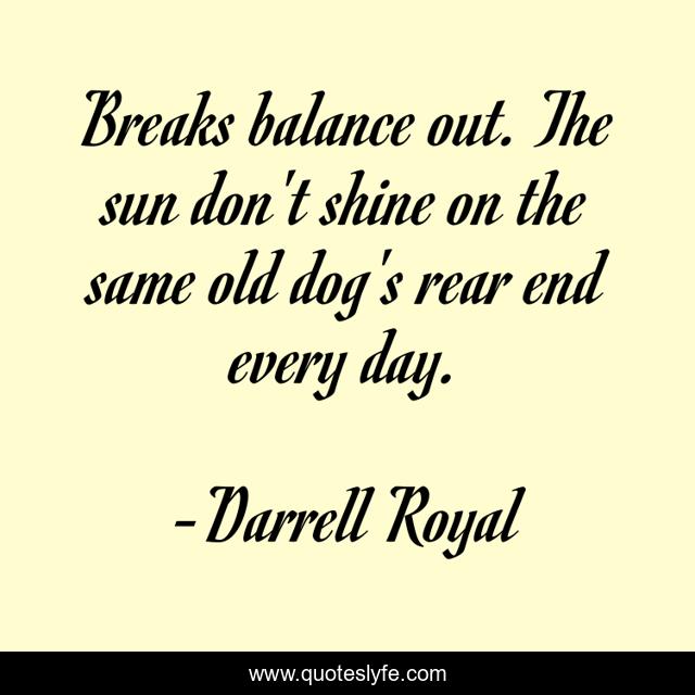 This page presents the quote "Breaks balance out. The sun don't shine on the same old dog's rear end every day.". Author of this quote is Darrell Royal. This quote is about recognize, maximize,.