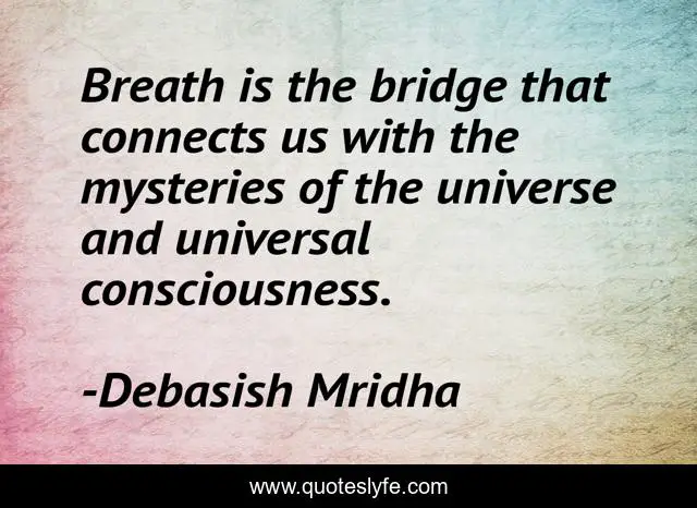 This page presents the quote "Breath is the bridge that connects us with the mysteries of the universe and universal consciousness.". Author of this quote is Debasish Mridha. This quote is about universal-consciousness, inspirational, consciousness, philosophy, debasish-mridha, quotes, mysteries-of-the-universe, enthusiasm, debasish-mridha-m-d,.
