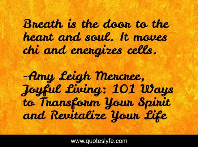 This page presents the quote "Breath is the door to the heart and soul. It moves chi and energizes cells.". Author of this quote is Amy Leigh Mercree, Joyful Living: 101 Ways to Transform Your Spirit and Revitalize Your Life. This quote is about life, breathing, amy-leigh-mercree, quote-of-the-day, quote-about-life, spiritual, joyful-living, soulful, quotes-de-la-vida,.