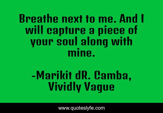 This page presents the quote "Breathe next to me. And I will capture a piece of your soul along with mine.". Author of this quote is Marikit dR. Camba, Vividly Vague. This quote is about capture, oneness, love, soul, affection,.