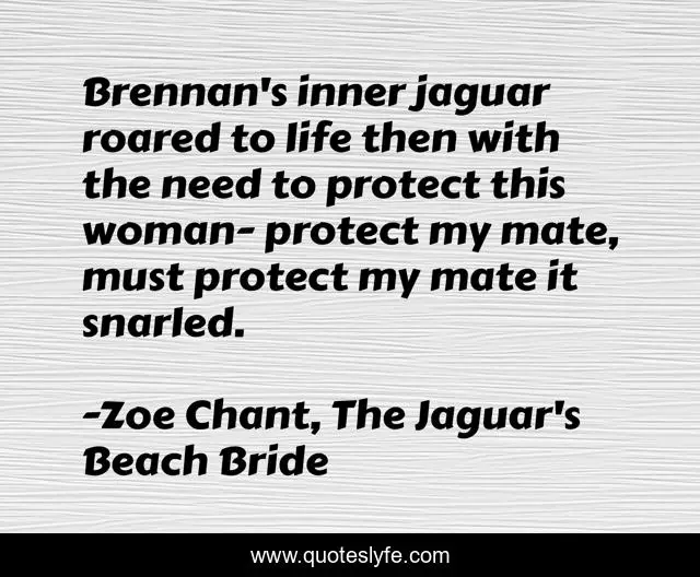 This page presents the quote "Brennan's inner jaguar roared to life then with the need to protect this woman- protect my mate, must protect my mate it snarled.". Author of this quote is Zoe Chant, The Jaguar's Beach Bride. This quote is about protective, love, shifters, urban-fantasy, mates, paranormal-romance, affection,.