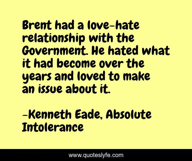 This page presents the quote "Brent had a love-hate relationship with the Government. He hated what it had become over the years and loved to make an issue about it.". Author of this quote is Kenneth Eade, Absolute Intolerance. This quote is about question-authority, government-corruption, authority, government,.