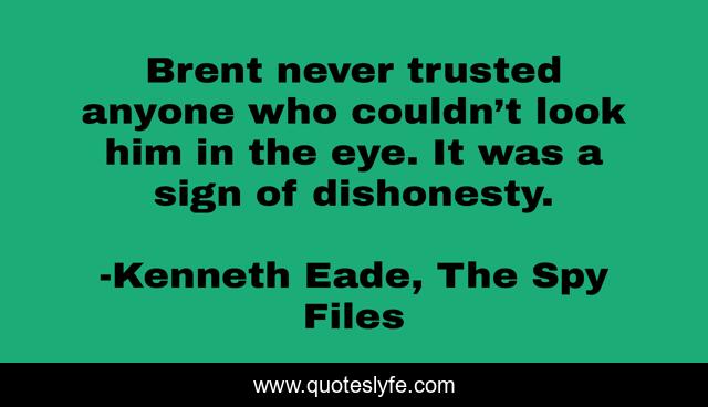 This page presents the quote "Brent never trusted anyone who couldn’t look him in the eye. It was a sign of dishonesty.". Author of this quote is Kenneth Eade, The Spy Files. This quote is about dishonesty, honesty, eye-contact,.