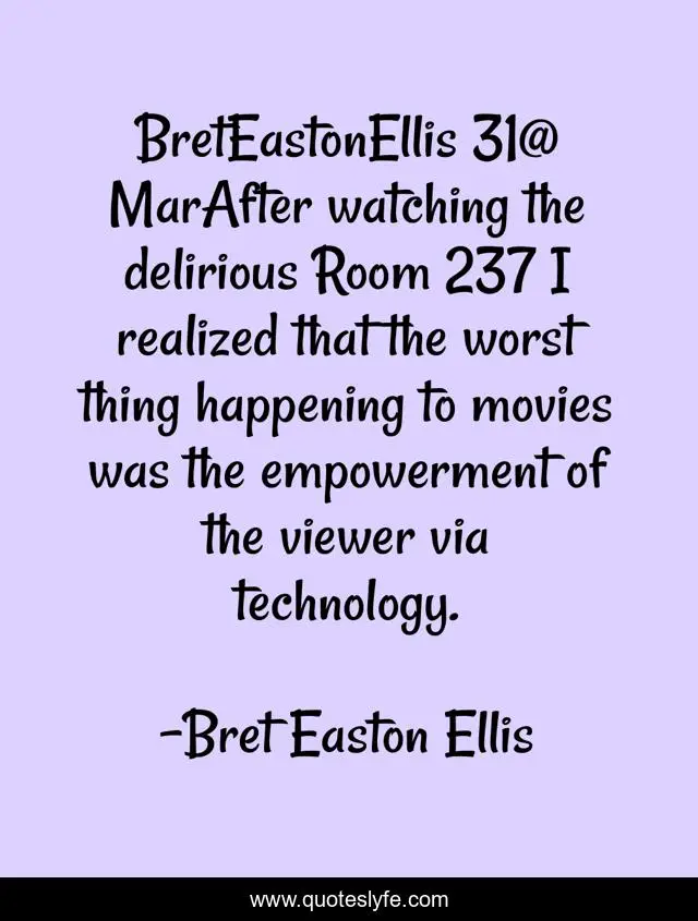 This page presents the quote "@BretEastonEllis 31 MarAfter watching the delirious Room 237 I realized that the worst thing happening to movies was the empowerment of the viewer via technology.". Author of this quote is Bret Easton Ellis. This quote is about movies, cinema,.