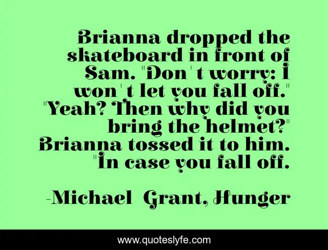 This page presents the quote "Brianna dropped the skateboard in front of Sam. "Don't worry: I won't let you fall off." "Yeah? Then why did you bring the helmet?" Brianna tossed it to him. "In case you fall off.". Author of this quote is Michael Grant, Hunger. This quote is about humor, safety, gone-series, skateboarding,.