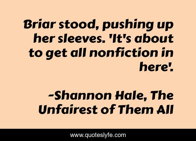 This page presents the quote "Briar stood, pushing up her sleeves. 'It's about to get all nonfiction in here'.". Author of this quote is Shannon Hale, The Unfairest of Them All. .