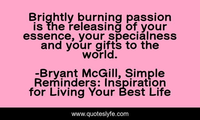 This page presents the quote "Brightly burning passion is the releasing of your essence, your specialness and your gifts to the world.". Author of this quote is Bryant McGill, Simple Reminders: Inspiration for Living Your Best Life. This quote is about brightness, essence, releasing, gifts, passion, specialness,.