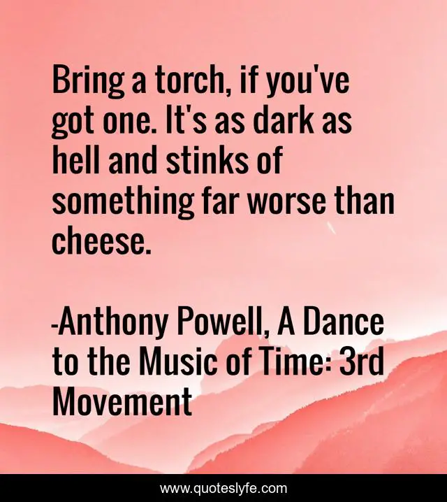 This page presents the quote "Bring a torch, if you've got one. It's as dark as hell and stinks of something far worse than cheese.". Author of this quote is Anthony Powell, A Dance to the Music of Time: 3rd Movement. This quote is about dark, cheese, stringham,.