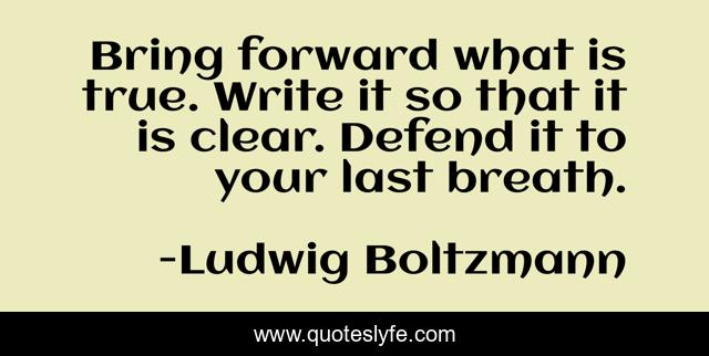 This page presents the quote "Bring forward what is true. Write it so that it is clear. Defend it to your last breath.". Author of this quote is Ludwig Boltzmann. This quote is about science, inspirational, enthusiasm,.