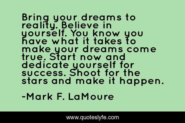 This page presents the quote "Bring your dreams to reality. Believe in yourself. You know you have what it takes to make your dreams come true. Start now and dedicate yourself for success. Shoot for the stars and make it happen.". Author of this quote is Mark F. LaMoure. This quote is about exceptional-people, high-caliber, high-quality, success, positive, excellent-people, excellent, confidence, excellence,.