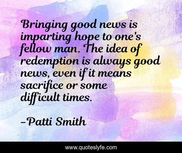 This page presents the quote "Bringing good news is imparting hope to one's fellow man. The idea of redemption is always good news, even if it means sacrifice or some difficult times.". Author of this quote is Patti Smith. This quote is about sacrifice, good, man,.