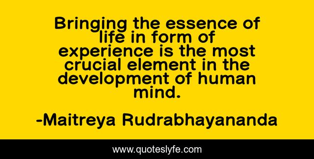 This page presents the quote "Bringing the essence of life in form of experience is the most crucial element in the development of human mind.". Author of this quote is Maitreya Rudrabhayananda. This quote is about development, life, life-experience, essence-of-life, mind, human-mind, experience, human,.