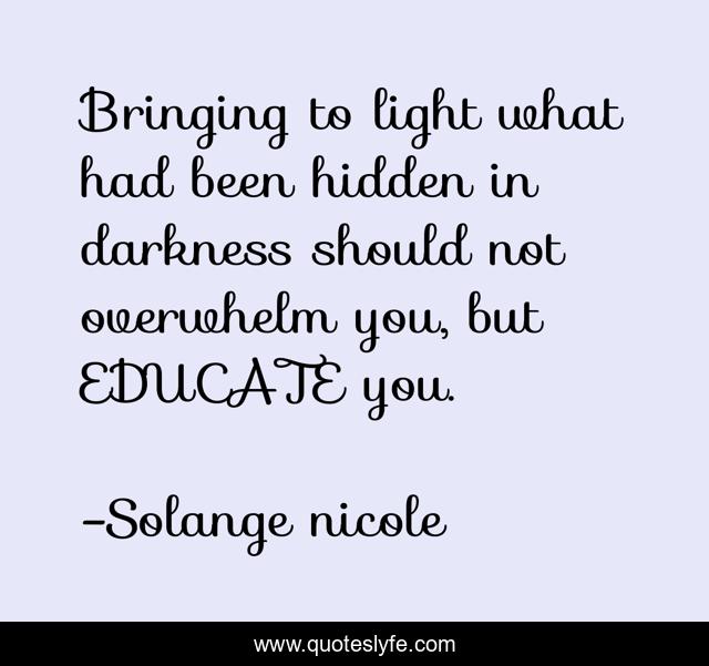 This page presents the quote "Bringing to light what had been hidden in darkness should not overwhelm you, but EDUCATE you.". Author of this quote is Solange nicole. This quote is about equality, enlightenment, solange, awareness, life-lessons,.