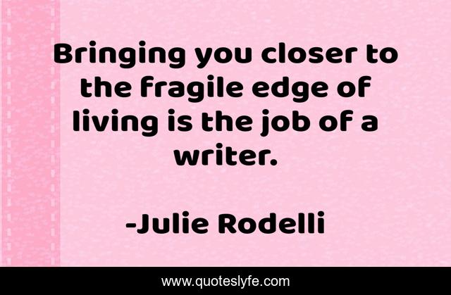 This page presents the quote "Bringing you closer to the fragile edge of living is the job of a writer.". Author of this quote is Julie Rodelli. This quote is about writing-philosophy, writing-craft, writing,.