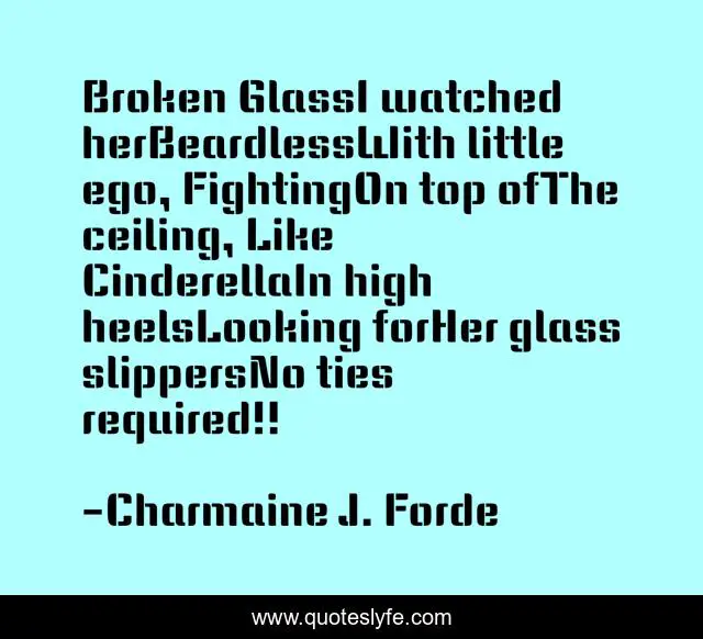This page presents the quote "Broken GlassI watched herBeardlessWith little ego, FightingOn top ofThe ceiling, Like CinderellaIn high heelsLooking forHer glass slippersNo ties required!!". Author of this quote is Charmaine J. Forde. This quote is about beardless, ceiling, cinderella, ego, glass,.
