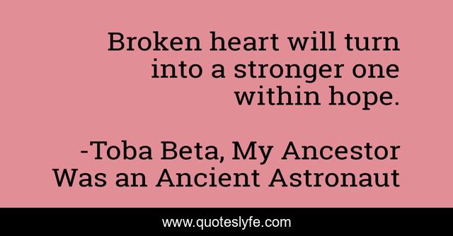 This page presents the quote "Broken heart will turn into a stronger one within hope.". Author of this quote is Toba Beta, My Ancestor Was an Ancient Astronaut. This quote is about better, broken-heart, hope,.