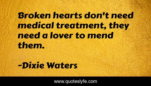 This page presents the quote "Broken hearts don't need medical treatment, they need a lover to mend them.". Author of this quote is Dixie Waters. This quote is about broken-heart, heart, love, mending, lover, affection,.
