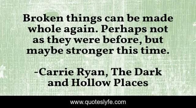 This page presents the quote "Broken things can be made whole again. Perhaps not as they were before, but maybe stronger this time.". Author of this quote is Carrie Ryan, The Dark and Hollow Places. .