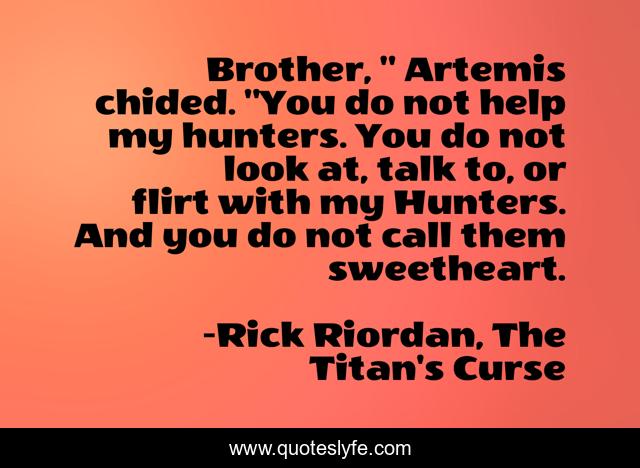 This page presents the quote "Brother, " Artemis chided. "You do not help my hunters. You do not look at, talk to, or flirt with my Hunters. And you do not call them sweetheart.". Author of this quote is Rick Riordan, The Titan's Curse. .