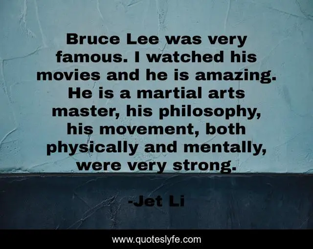 This page presents the quote "Bruce Lee was very famous. I watched his movies and he is amazing. He is a martial arts master, his philosophy, his movement, both physically and mentally, were very strong.". Author of this quote is Jet Li. This quote is about amazing, strong, philosophy,.
