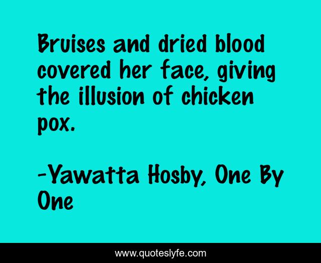 This page presents the quote "Bruises and dried blood covered her face, giving the illusion of chicken pox.". Author of this quote is Yawatta Hosby, One By One. This quote is about horror, psychological-mindgames, thriller,.