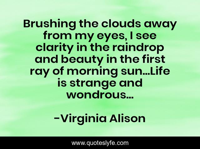 This page presents the quote "Brushing the clouds away from my eyes, I see clarity in the raindrop and beauty in the first ray of morning sun...Life is strange and wondrous...". Author of this quote is Virginia Alison. This quote is about life, clouds, beauty, rain, raindrops, clarity,.